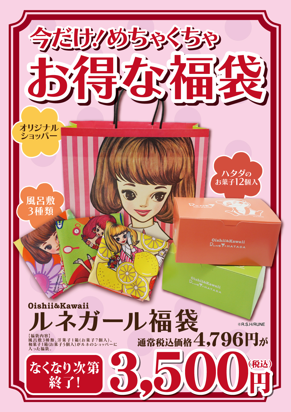 ハタダのおいしいお菓子12個と、人気のルネガール風呂敷3枚が入った福袋が