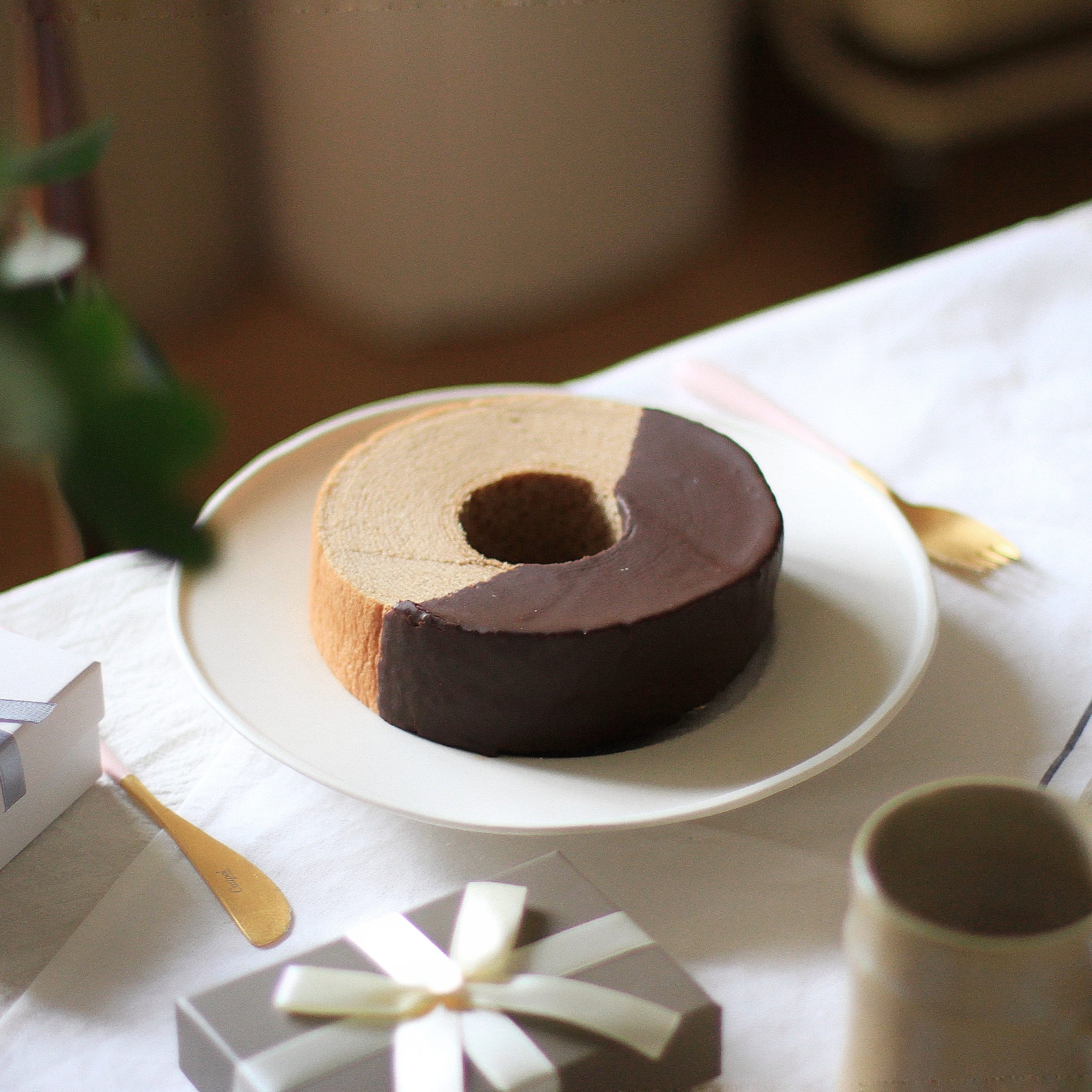 ふんわり食感のショコラバームクーヘンにチョコレートをコーティング。