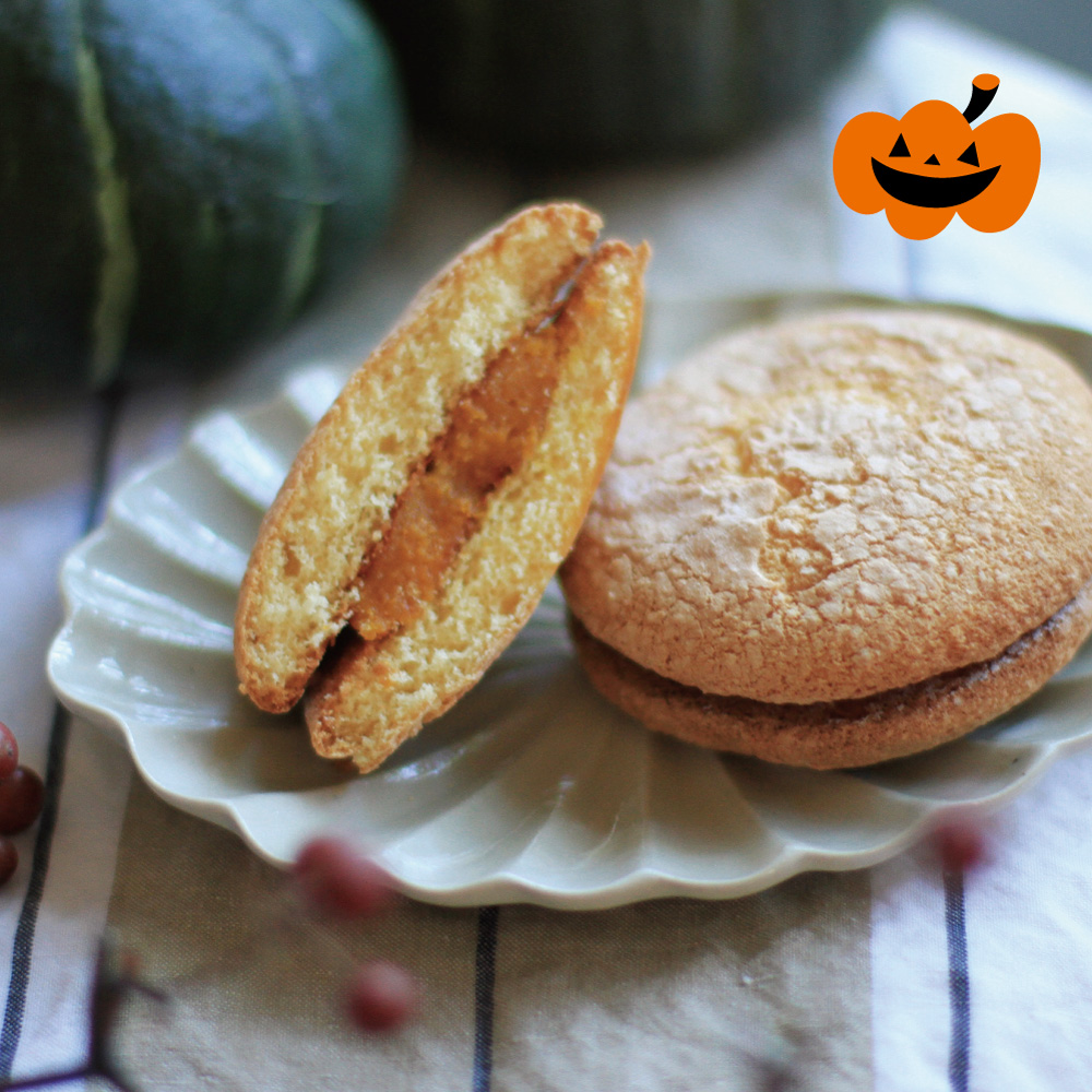 ほっこり蒸したかぼちゃの優しい甘さ感じるクリームを、ふわふわブッセではさみました。