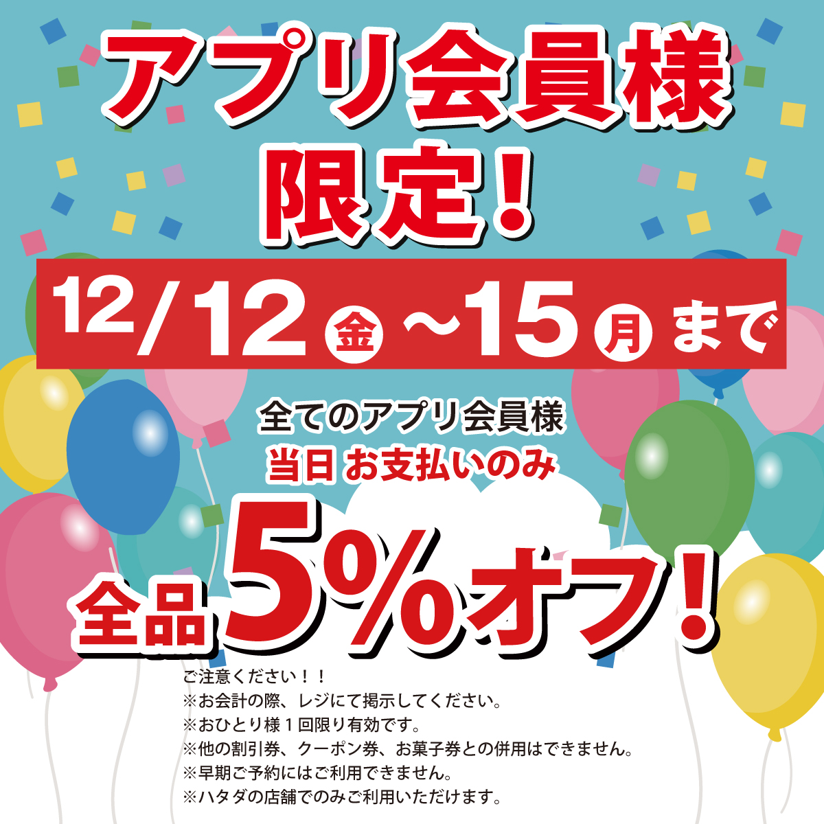 明日から12月15日(月)までの4日間限定‼️アプリ会員様限定 全品5%オフ‼️