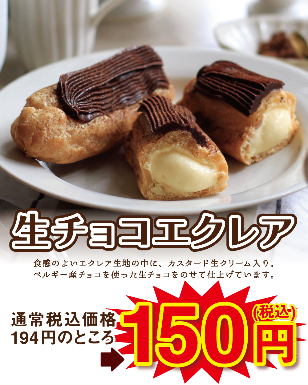 「生チョコエクレア」が、1個150円 (税込)で、お得に買えちゃいます🎵