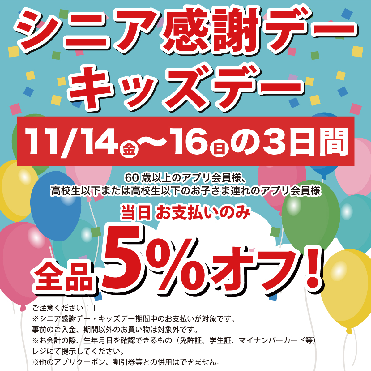 11月14日(金)〜16日(日)は、シニア感謝デー・キッズデー‼️