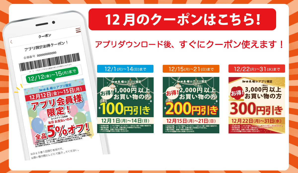 ※ハタダ店舗でのみ、おひとり様1回限りご利用可能です。クーポンはアプリ限定配信です。