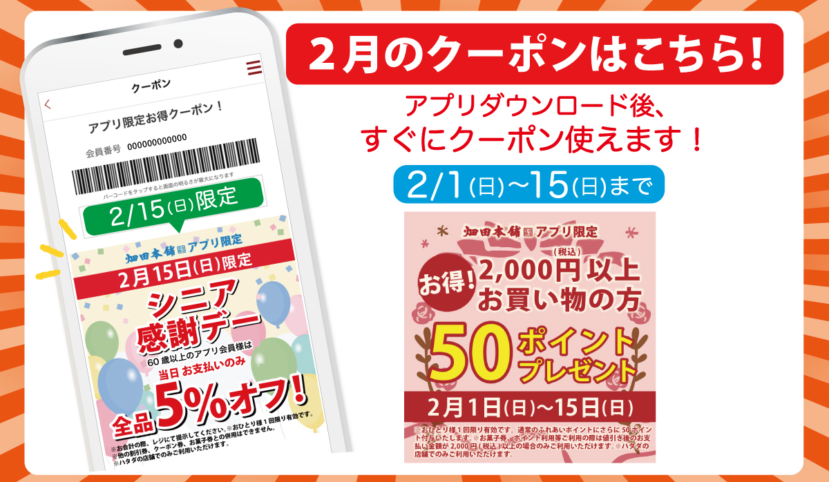 ハタダ公式アプリでは、毎月、人気お菓子がお得に買える!貰える!クーポンを配信しています📱