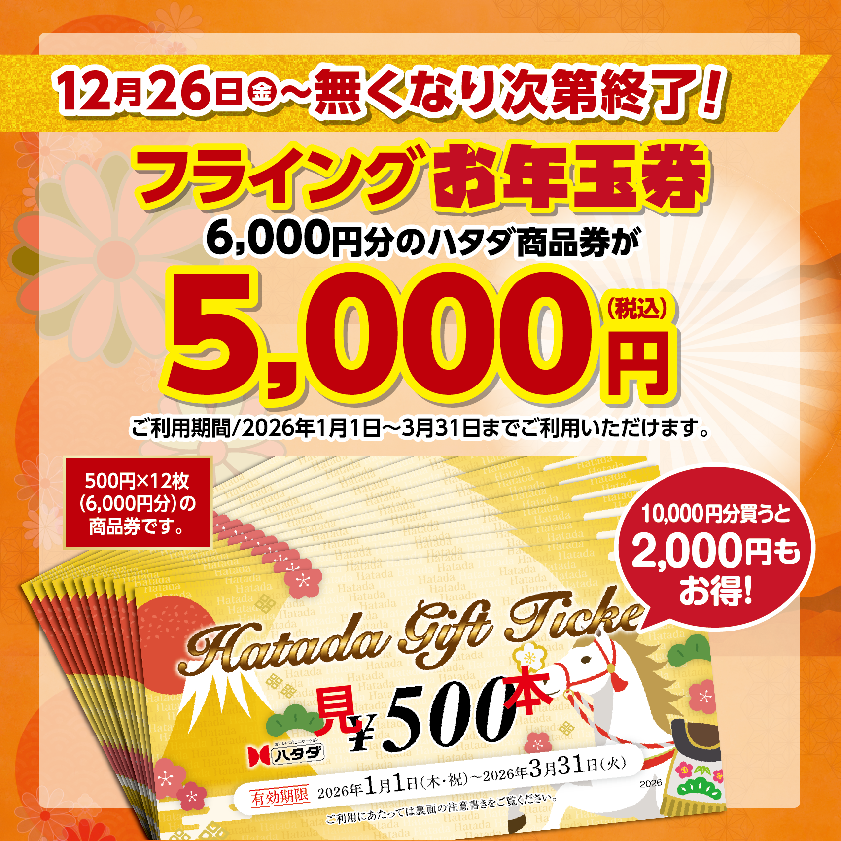 こんにちは、お菓子のハタダです❗️ 12月26日(金)から販売‼️なくなり次第終了‼️ フライングお年玉券🧧✨ 6,000円(税込)分のハタダ商品券が、 5,000円(税込)でご購