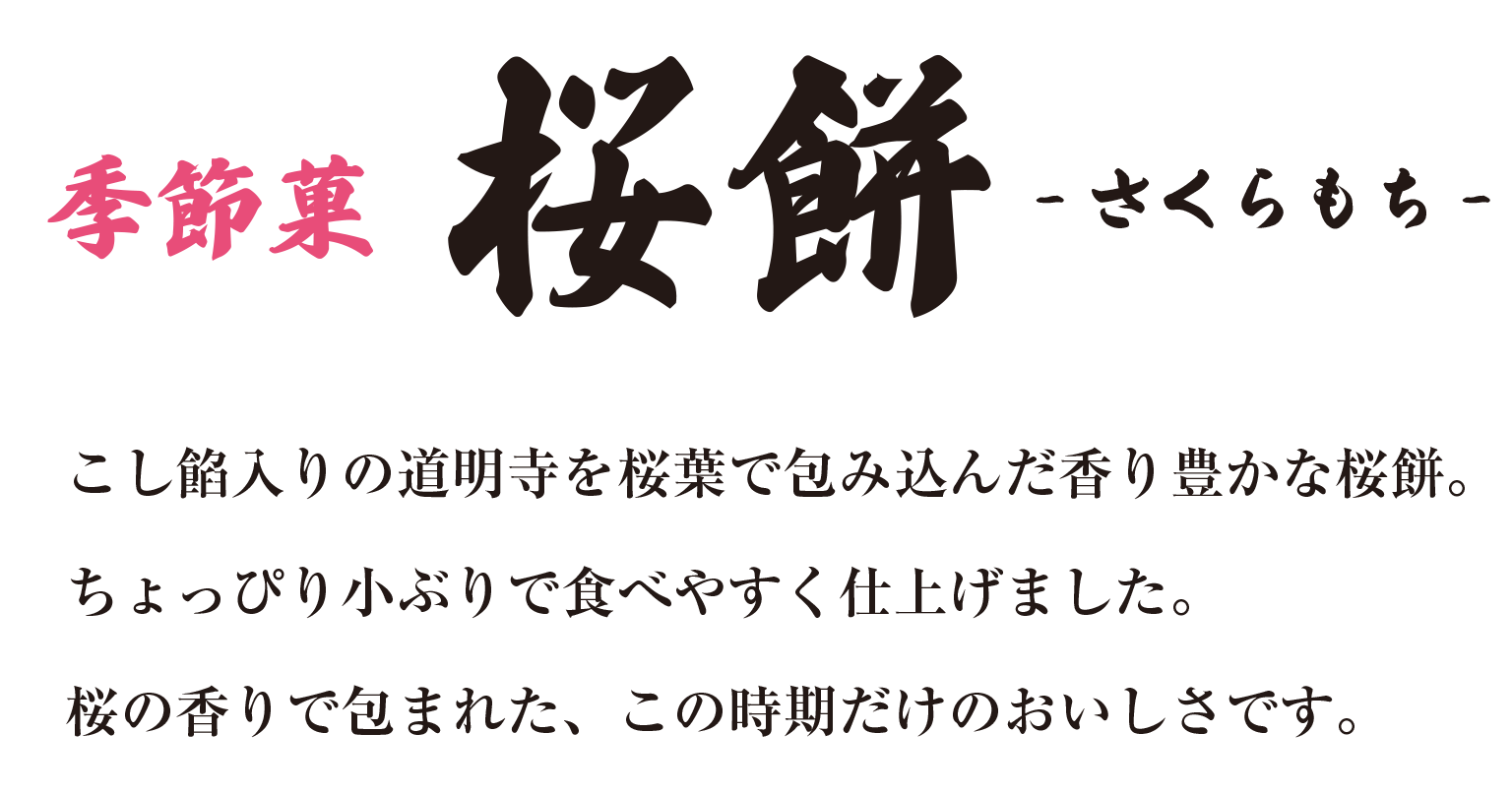 季節菓 桜餅 こし餡入りの道明寺を桜葉で包み込んだ香り豊かな桜餅。ちょっぴり小ぶりで食べやすく仕上げております。桜の香りが広がる春の味わいをお楽しみください。